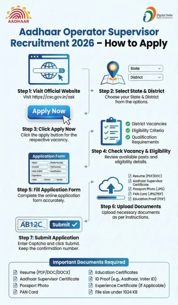 CSC Aadhaar Supervisor Operator Recruitment 2026 માટે કેવી રીતે અરજી કરવી